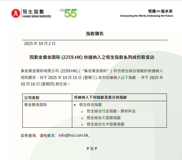 恒生指数公司:紫金黄金国际将于10月15日收市后被纳入恒生综合指数