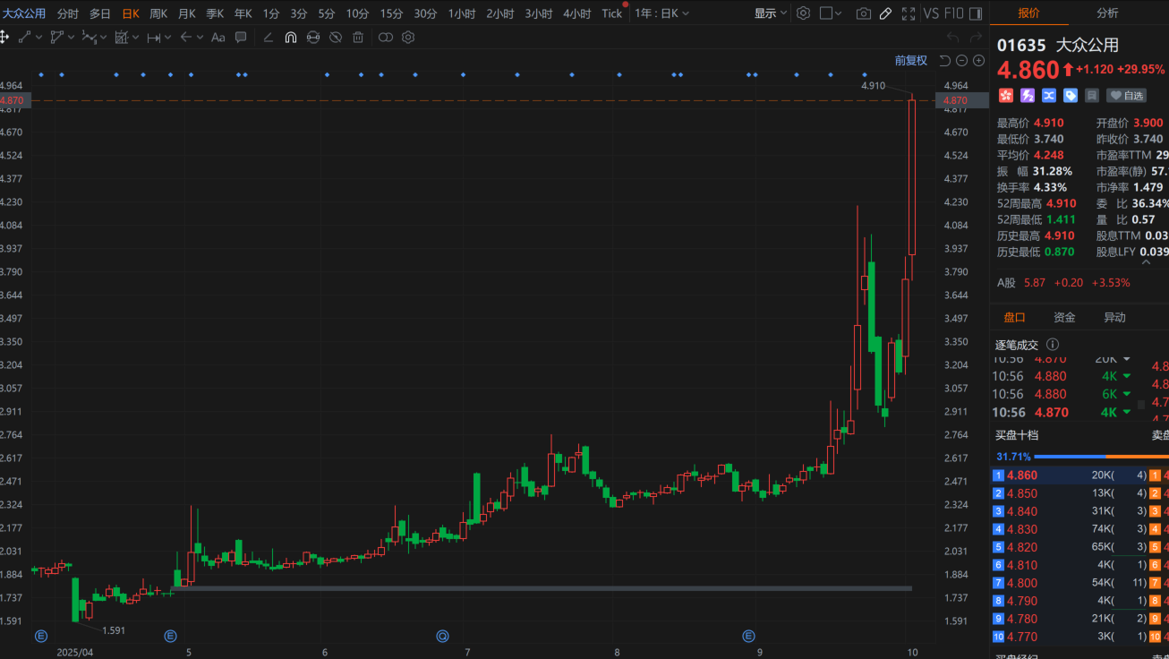 财联社10月3日电,港股大众公用 (01635.HK)$ 股价持续拉升,现涨超30%,盘中最高见4.9港元,创历史新高。消息面上,大众公用此前在互动平台表示,公司参股深创投,深创投及其基金持有宇树科技股份。据悉,宇树科技预计于今年四季度向证券交易所提交上市申请文件。此外,9月26日,上交所官网披露信息显示,摩尔线程科创板IPO申请通过上交所上市委会议审议。摩尔线程成立后曾获得包括深创投在内的多家机构投资。公开资料显示,大众公用为公用事业与金融创投齐头并进的投资控股型企业,其中,创投业务是大众公用较为重要的业务板块和利润来源,该公司持有深创投10.80%股权。