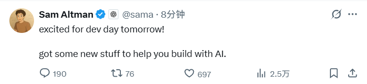 财联社10月6日电,OpenAI CEO奥尔特曼称,明天的开发者大会(Dev Day)准备了一些新内容,助力大家用人工智能(AI)进行开发创作。