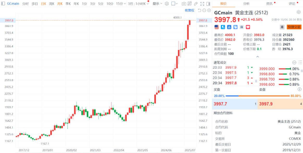 纽约期金首次触及4000美元/盎司整数大关 年内大涨逾50%
