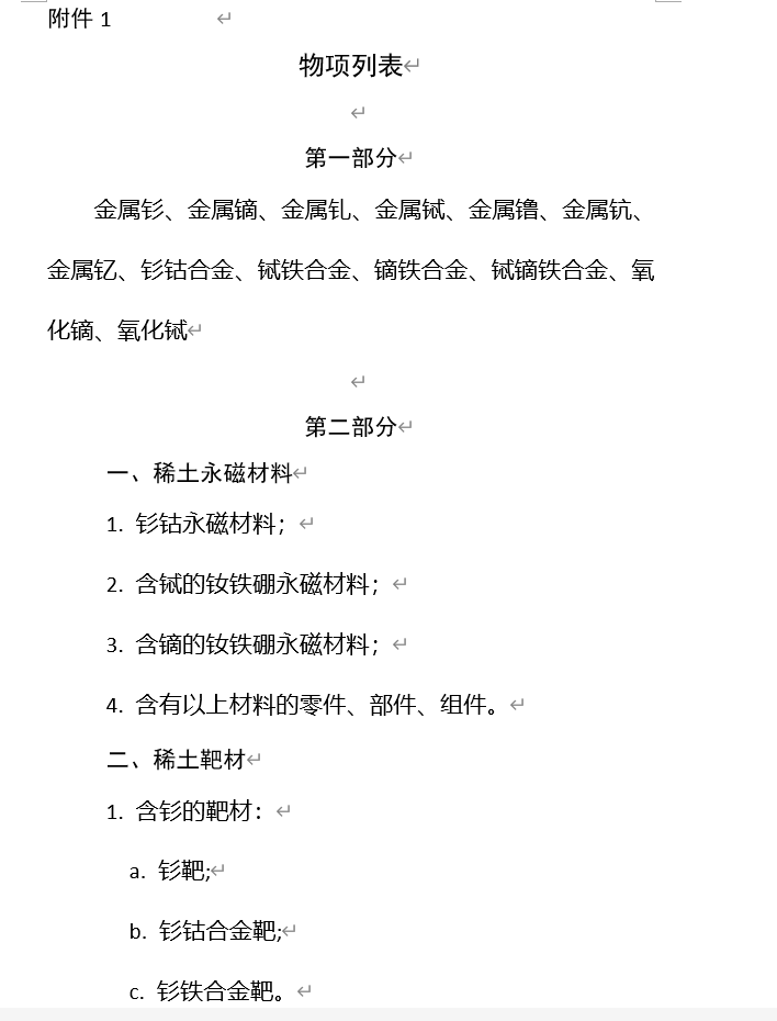 (二)使用原产于中国的稀土开采、冶炼分离、金属冶炼、磁材制造、稀土二次资源回收利用相关技术在境外生产的本公告附件1所列物项;