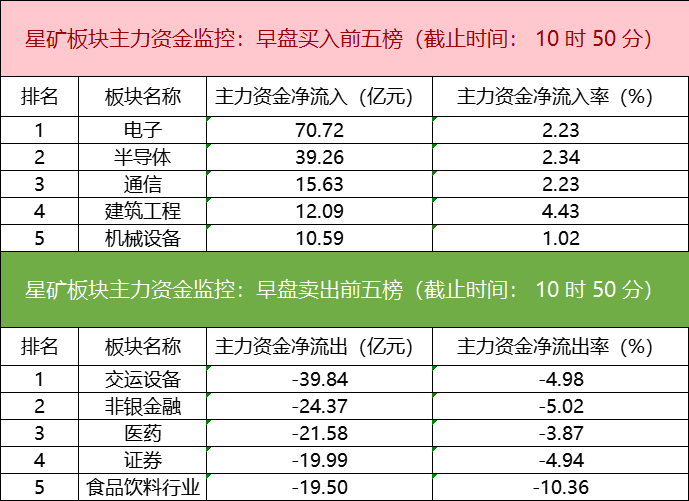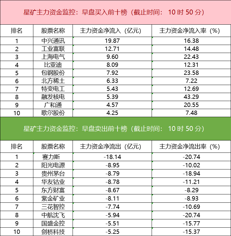 财联社10月9日电,财联社星矿数据显示,今日早盘主力资金净流入电子、半导体、通信等板块,其中电子板块净流入超70亿元;净流出交通运输、非银金融、医药等板块。个股方面,中兴通讯涨停,主力资金净买入近20亿元位居首位,工业富联、上海电气、比亚迪获主力资金净流入居前;赛力斯遭净卖出超18亿元,阳光电源、贵州茅台、华友钴业资金净流出额居前。