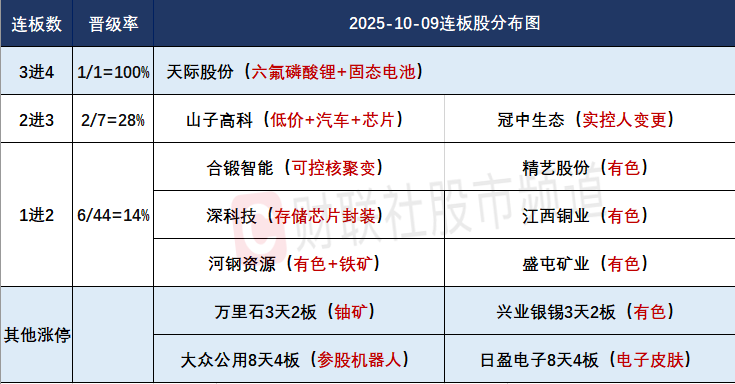 今日共88股涨停,连板股总数9只,其中三连板及以上个股3只,上一交易日共10只连板股,连板股晋级率30%(不含ST股、退市股)。个股方面,高位股表现低迷,蓝丰生化遭遇天地板,华建集团开盘冲高回落,最终收跌,天际股份放量晋级4连板。板块方面,受到国庆假期内国际金价、铜价上涨的刺激,有色金属板块全天维持强势,其中精艺股份6天5板,江西铜业、盛屯矿业、兴业银锡等均晋级2板,紫金矿业涨超9%;核电板块掀起涨停潮,全天超20只个股涨停,其中合锻智能8天4板2连板,万里石3天2板,常辅股份30CM涨停,消息面上,中国核聚变装置BEST建设取得关键突破,有望在2030年通过核聚变发电点亮第一盏灯。