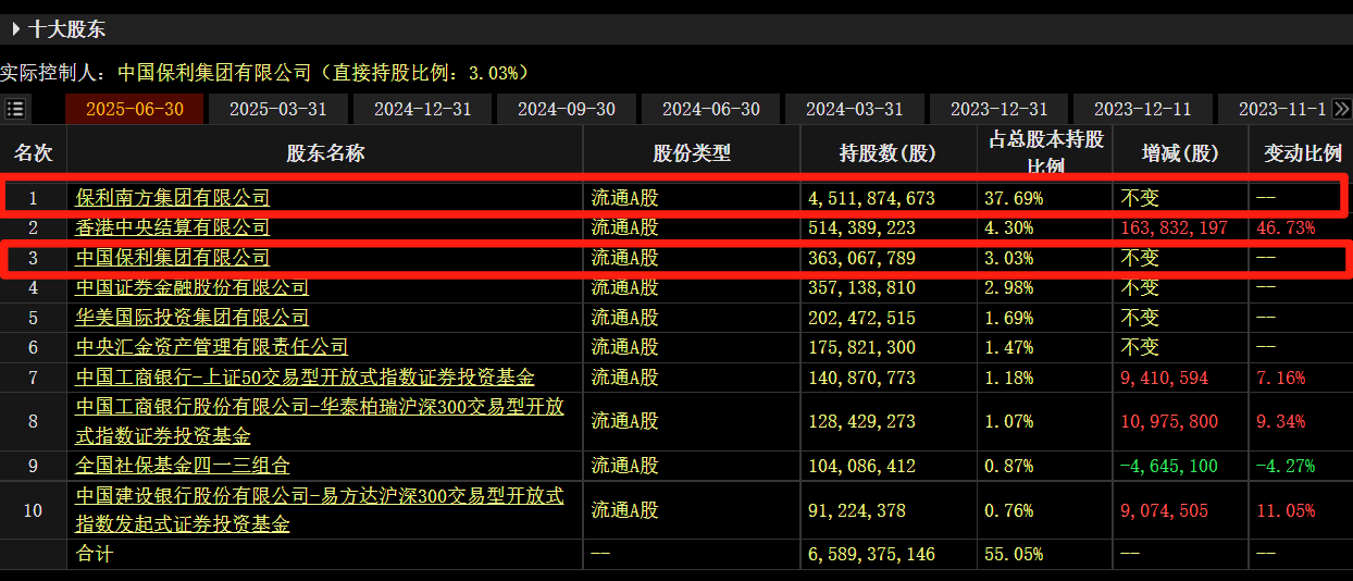 小财注:截至二季度末,保利南方位列保利发展第一大股东,持股45.12亿股,占公司总股本的37.69%。保利集团位列第三大股东,持股3.63亿股,占总股本的3.03%。
