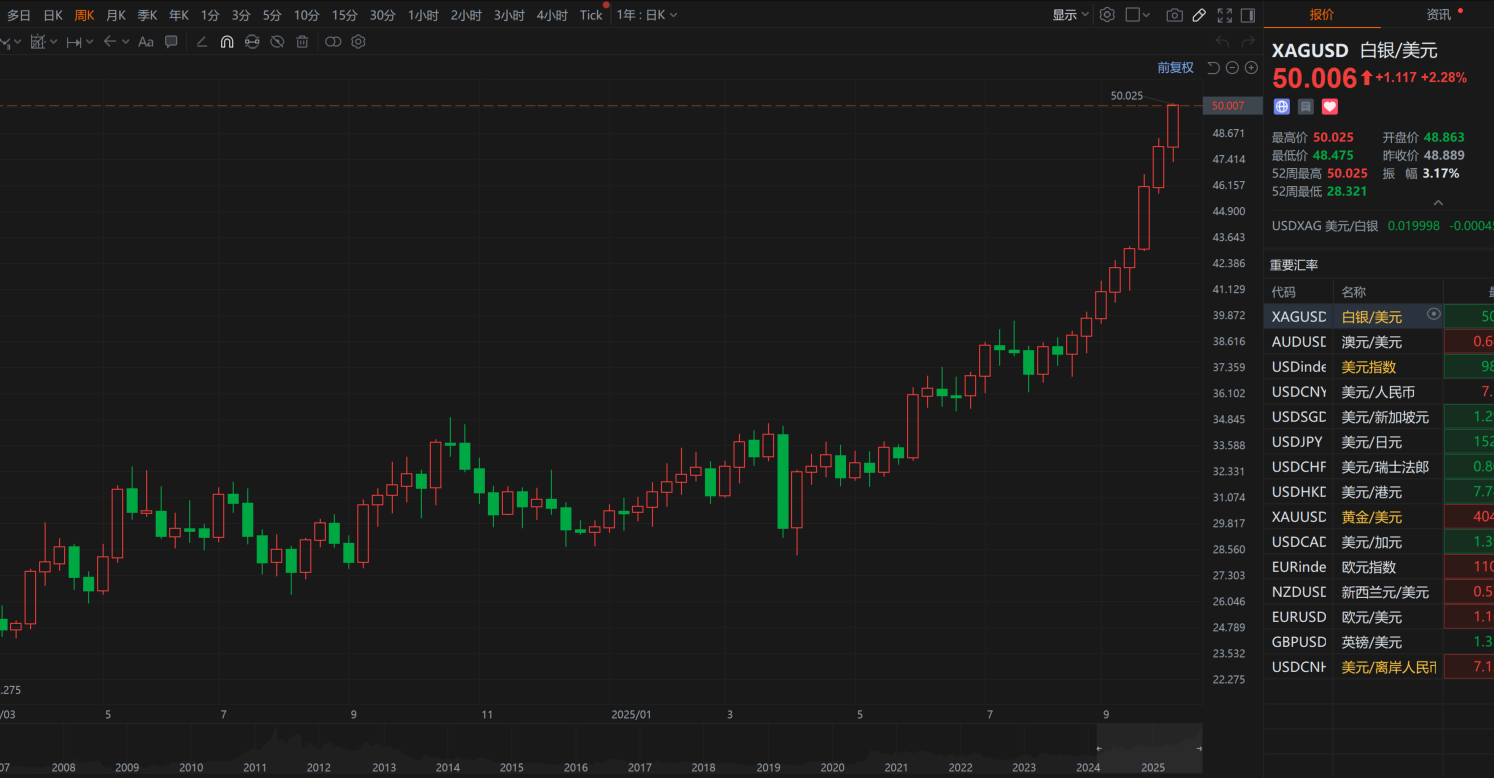 现货白银价格加速上涨 历史首次突破50美元/盎司