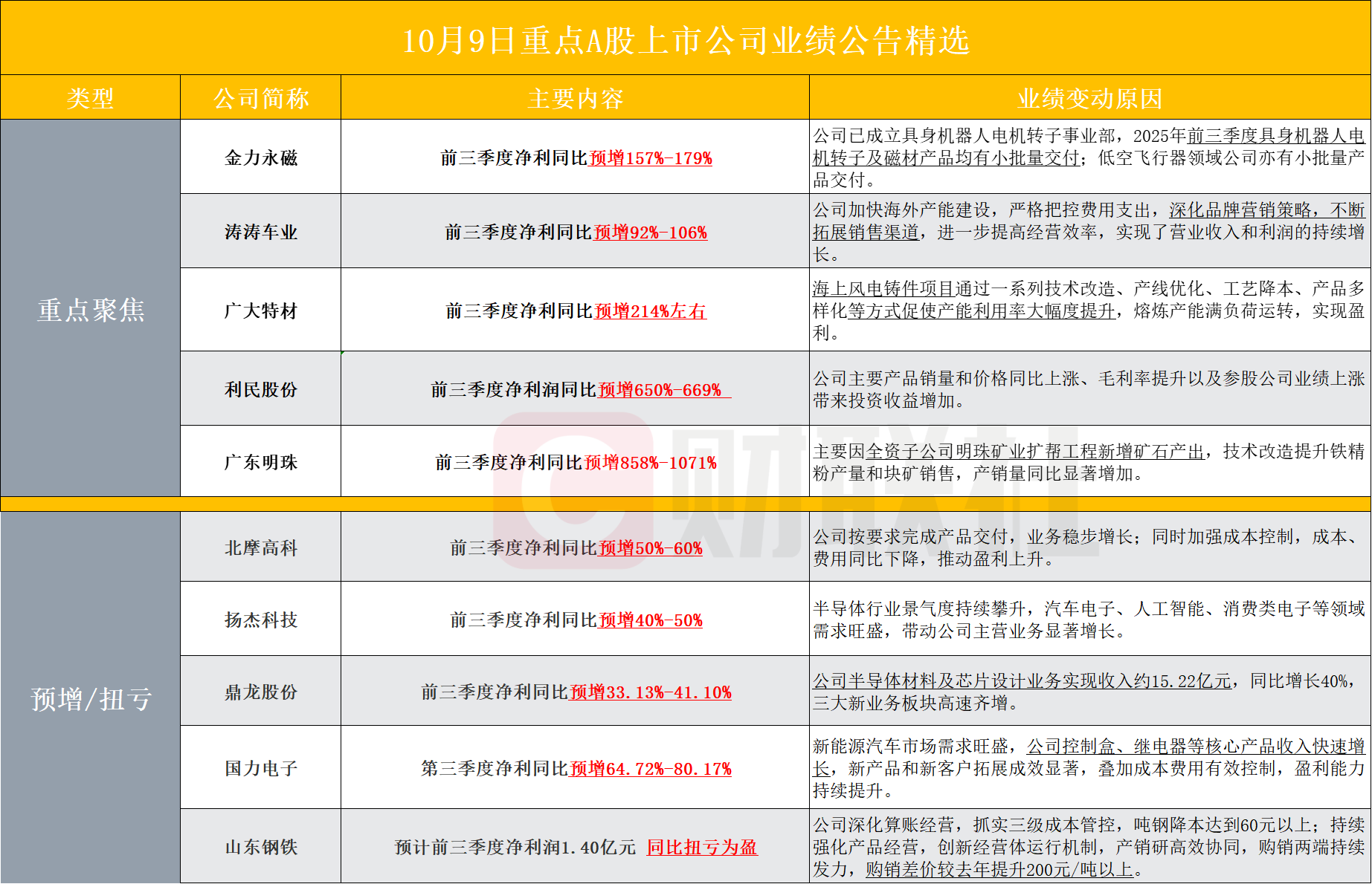 财联社10月9日电,据财联社不完全统计,截至发稿,盘后包括金力永磁、涛涛车业、广大特材、利民股份、广东明珠、北摩高科、扬杰科技、鼎龙股份、国力电子和山东钢铁在内的多家A股上市公司发布2025年三季度业绩预告。其中,金力永磁前三季度净利同比预增157%-179%,涛涛车业前三季度净利同比预增92%-106%。