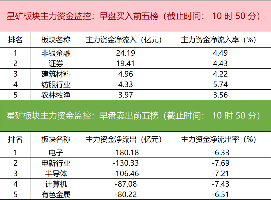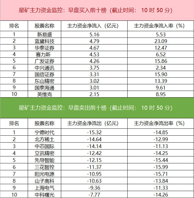 财联社10月10日电,财联社星矿数据显示,今日早盘主力资金净流入非银金融、证券、建筑材料等板块,净流出电子、电新行业、半导体等板块,其中电子板块净流出超180亿元。个股方面,新易盛上涨,主力资金净买入超5亿元位居首位,蓝黛科技、华泰证券、赛力斯获主力资金净流入居前;宁德时代遭净卖出超15亿元,北方稀土、中芯国际、立讯精密资金净流出额居前。