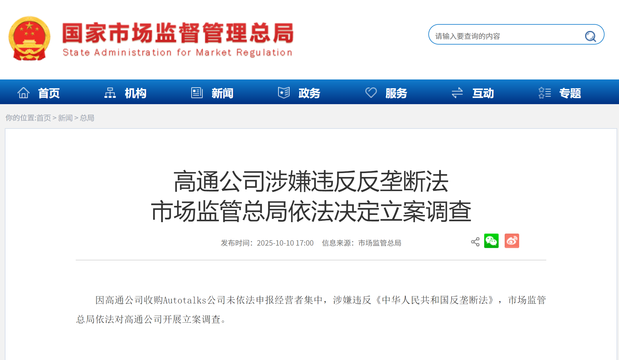 财联社10月10日电,因高通公司收购Autotalks公司未依法申报经营者集中,涉嫌违反《中华人民共和国反垄断法》,市场监管总局依法对高通公司开展立案调查。