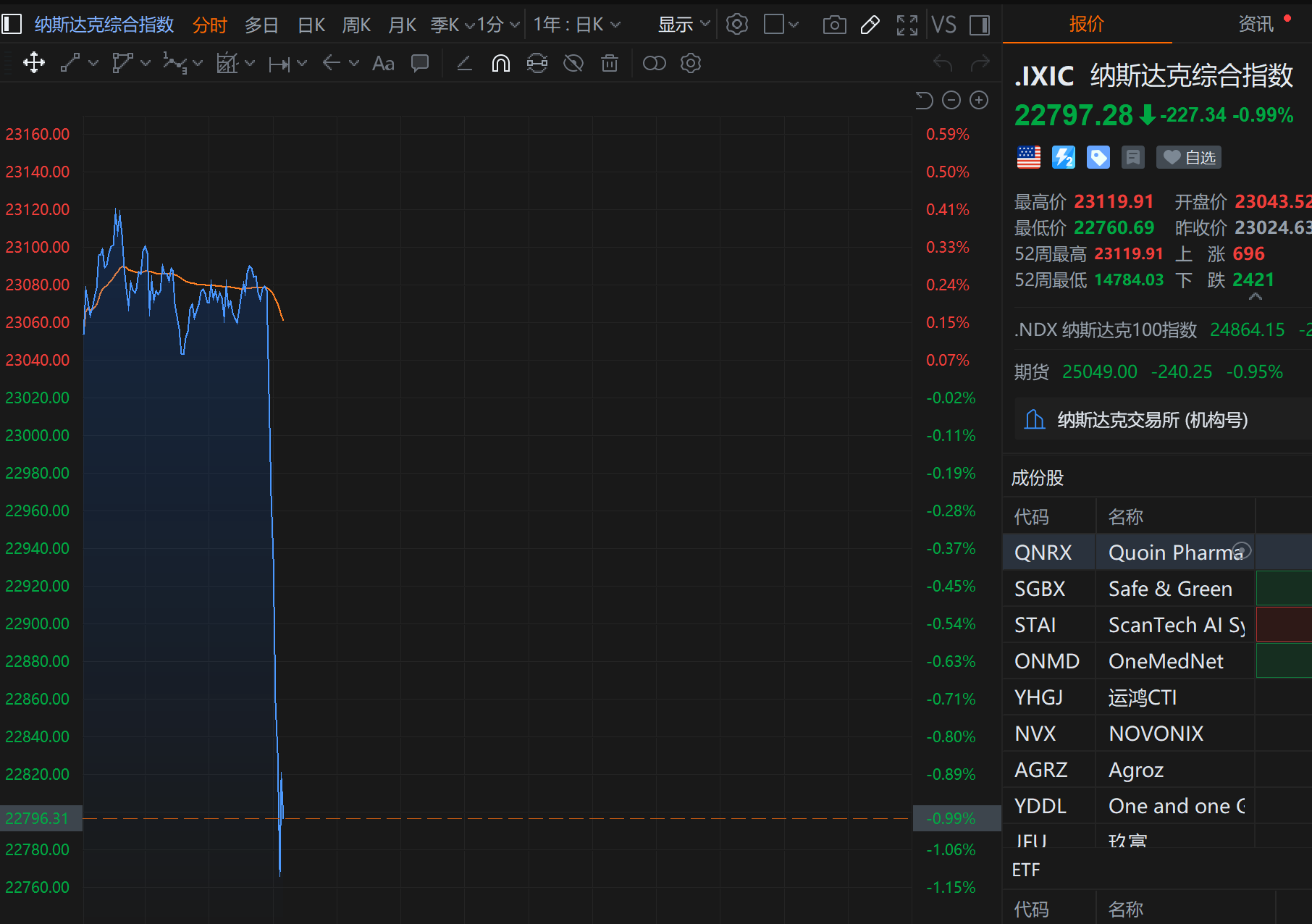 财联社10月10日电,美股迅速跳水,道琼斯指数跌0.63%,标普500指数跌0.69%,纳斯达克综合指数跌0.79%。