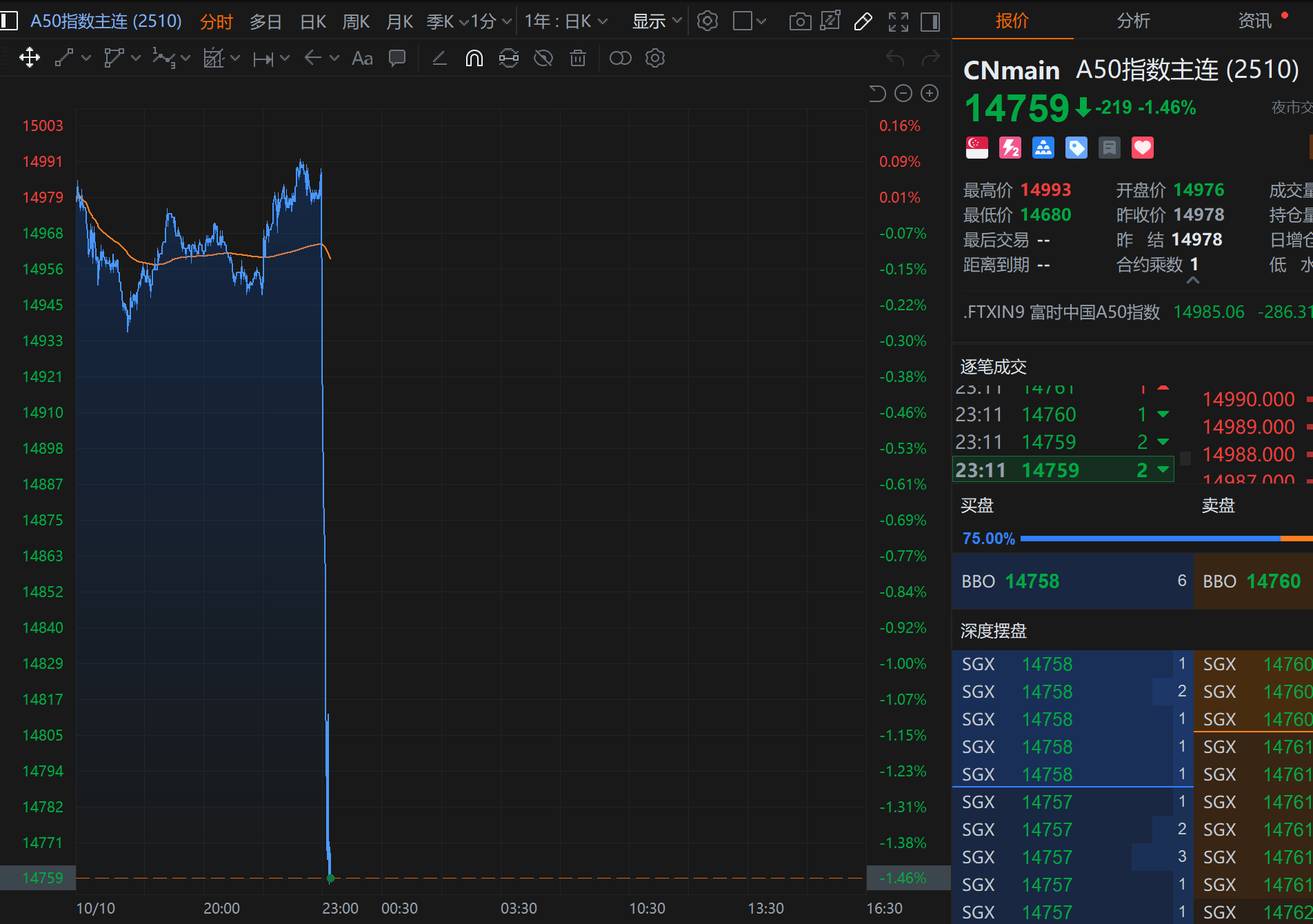 财联社10月10日电,富时中国A50指数期货跌幅扩大至1.43%,报14764.0点。