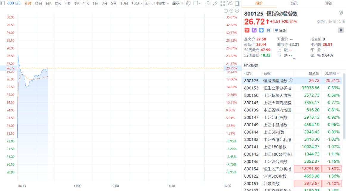 财联社10月13日电,恒指波幅指数大涨20%,创2025年5月以来新高。