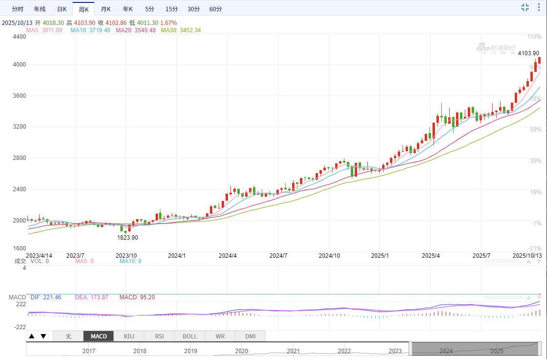 财联社10月13日电,COMEX黄金期货涨2.56%,报4102美元/盎司,再创历史新高。今年以来,COMEX黄金期货累计上涨1480美元/盎司,即56%。
