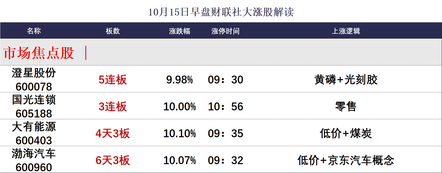 财联社10月15日电,今日午盘全市场共36股涨停,连板股总数8只,13股封板未遂,封板率为73%(不含ST股、退市股)。焦点股方面,澄星股份晋级5连板,零售股国光连锁国光连锁,低价股大有能源4天3板、渤海汽车6天3板。