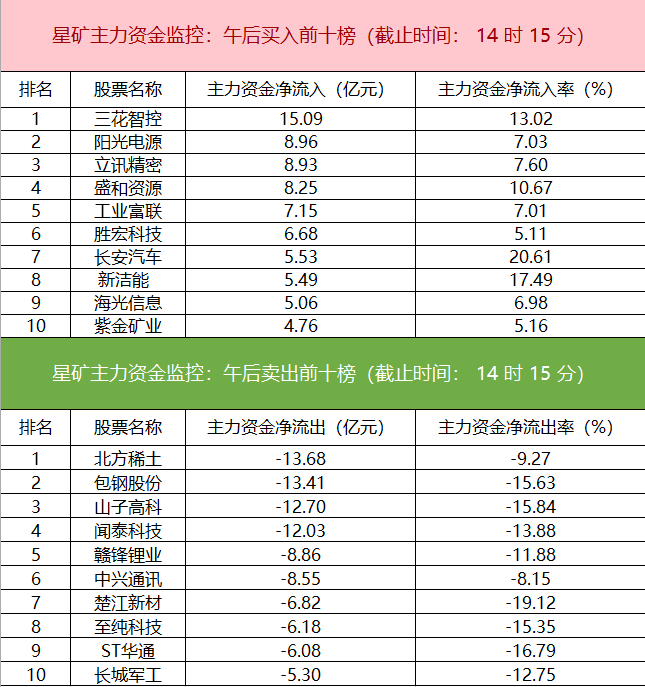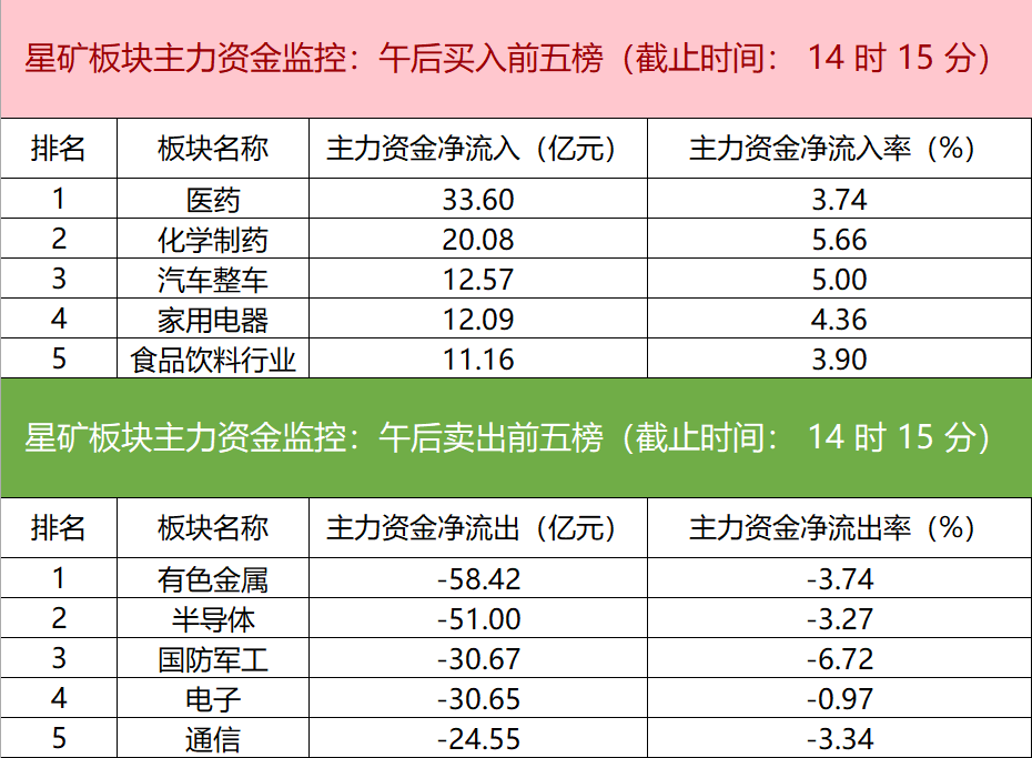 财联社10月15日电,财联社星矿数据显示,今日主力资金净流入医药、化学制药、汽车整车行业等板块,净流出有色金属、半导体、国防军工等板块,其中有色金属板块净流出超58亿元。个股方面,三花智控涨停,主力资金净买入15.09亿元位居首位,阳光电源、立讯精密、盛和资源主力资金净流入居前;北方稀土遭净卖出超13亿元位居首位,包钢股份、山子高科、闻泰科技主力资金净流出额居前。