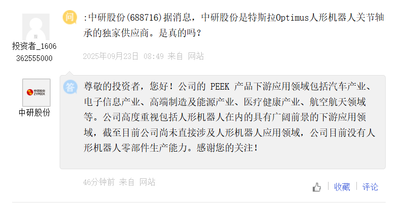 公司是特斯拉Optimus人形机器人关节轴承独家供应商?中研股份:目前没有人形机器人零部件生产能力