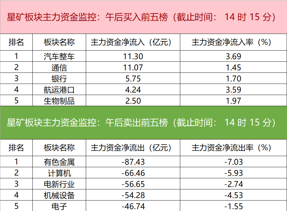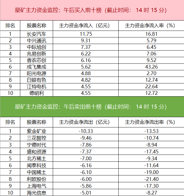 财联社10月16日电,财联社星矿数据显示,今日主力资金净流入汽车整车、通信、银行等板块,净流出有色金属、计算机、电新行业等板块,其中有色金属板块净流出超87亿元。个股方面,长安汽车上涨,主力资金净买入11.75亿元位居首位,中兴通讯、中际旭创、兆易创新主力资金净流入居前;紫金矿业遭净卖出超10亿元位居首位,三花智控、宁德时代、盛和资源主力资金净流出额居前。