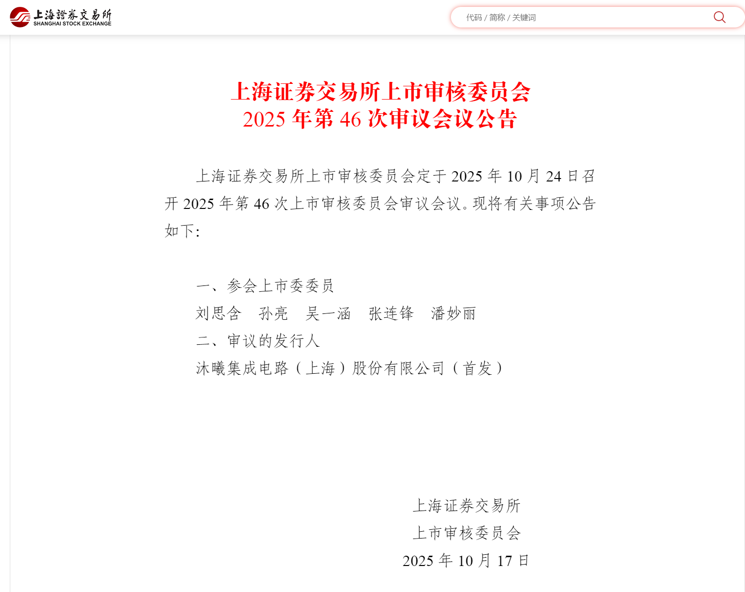 财联社10月18日电,上交所上市审核委员会10月17日公告,定于2025年10月24日召开2025年第46次上市审核委员会审议会议,审议沐曦集成电路(上海)股份有限公司首发事项。